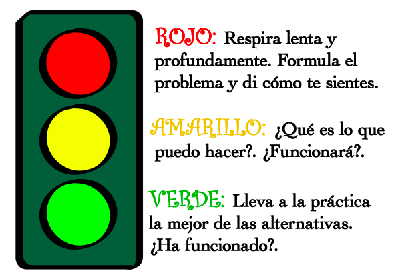 ROJO: PARARSE. Cuando no podemos controlar una emoción (sentimos mucha rabia, queremos agredir a alguien, nos ponemos muy nerviosos…) tenemos que pararnos como cuando un automóvil se encuentra con la luz roja del semáforo.